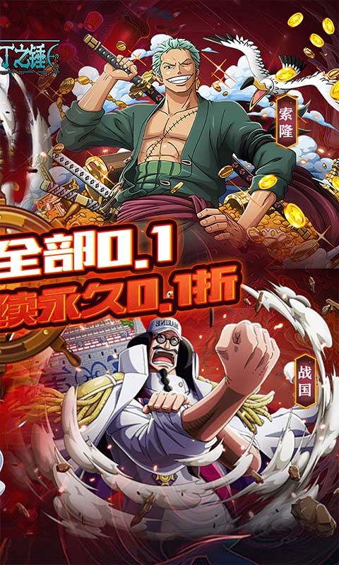 游戏介绍《奥丁之锤》0.1折路飞带你飞,问鼎新世界海贼王!绝对真实0.1折版本,所有充值永久首续0.1折!创角福利送新世界·路飞,登录再送超强索隆,超多经典海贼角色为你保驾护航,点燃你的经典情怀,重启航海远征之旅!