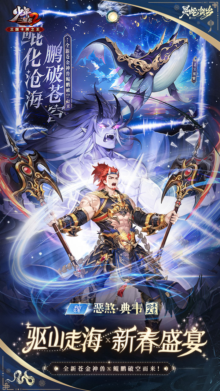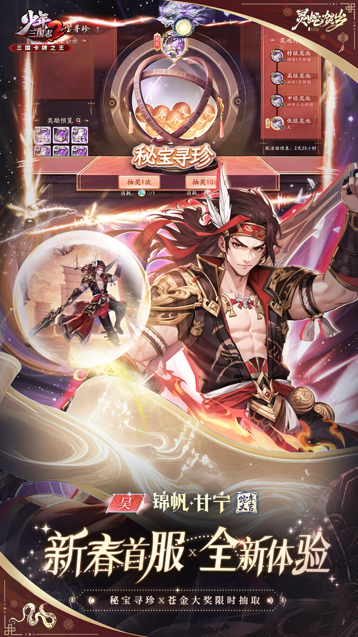 游戏介绍《少年三国志2》新春版本震撼上线!全新苍金五代武将【恶煞典韦】、【震威关羽】、【锦帆甘宁】、【制胜张辽】巅峰登场,助你所向披!全新神兵【七宝玲珑塔】降临,助你战力飙升!双重春节活动【年兽藏瑞】与【纳福迎春】上线,丰厚奖励等你拿!全新常驻玩法【发丘摸金】助你快速提升战力!春节超豪华礼包,苍金武将、装备大礼包等你领取,自动主线优化助力加速登顶!新春好时机,带上你的英雄一起创造传奇!