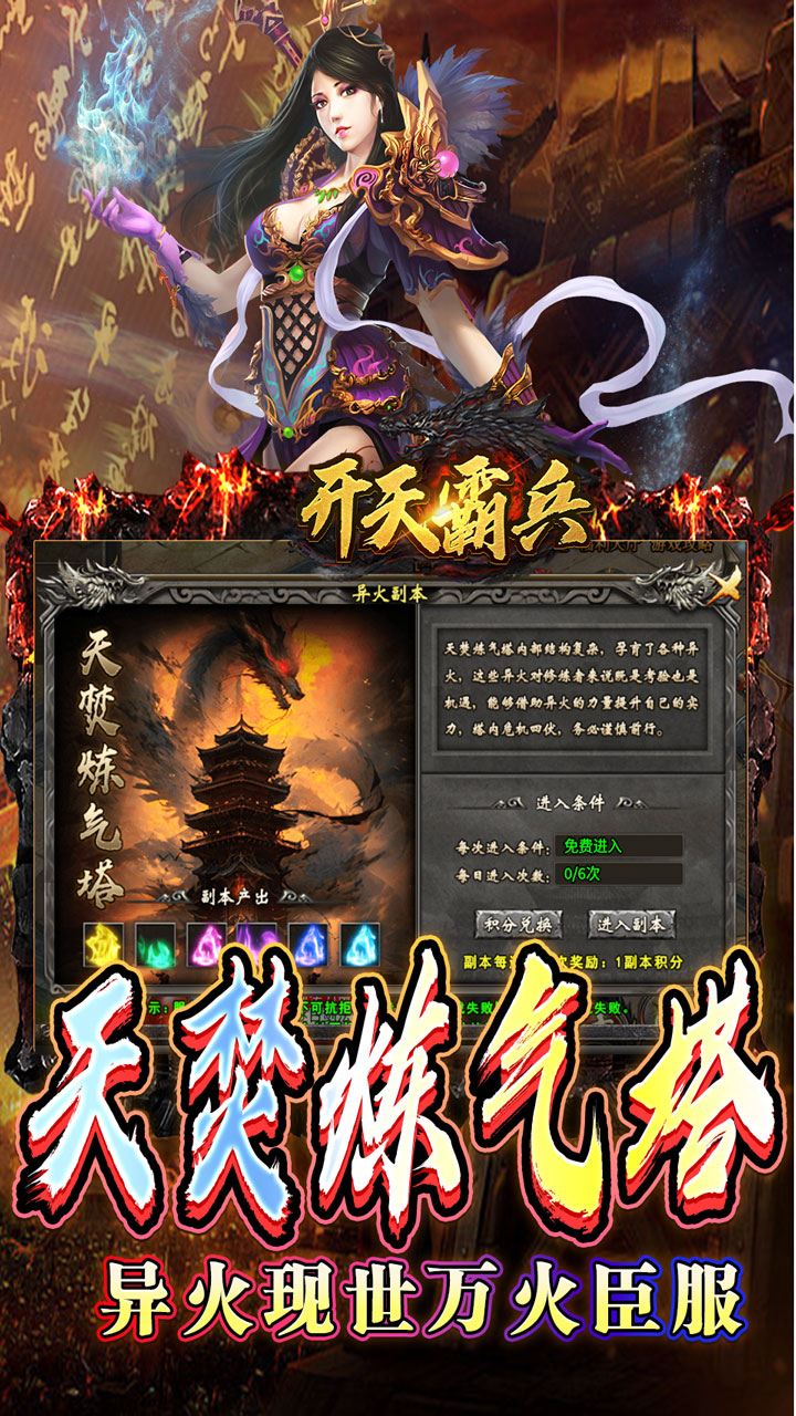 游戏介绍《开天霸兵(斗帝沉默免费版)》是一款全新高福利、特色剧情的沉默专属高福利免费版本。三折充值代币,每日登录送600代币。结合了神器、切割、打金、攻沙、跨服等玩法,斗破专属背景,异火、魂技、焚诀、炼药等玩法,乌坦城、加玛帝国、迦南学院、中州等地图大陆!各种探索剧情、专属玩法,回归传奇本色,一切装备靠打,时间称王。各类大陆专属玩法,大陆剧情任务等你来挑战,各类BOSS等你来击杀,快快加入与兄弟们征战吧!