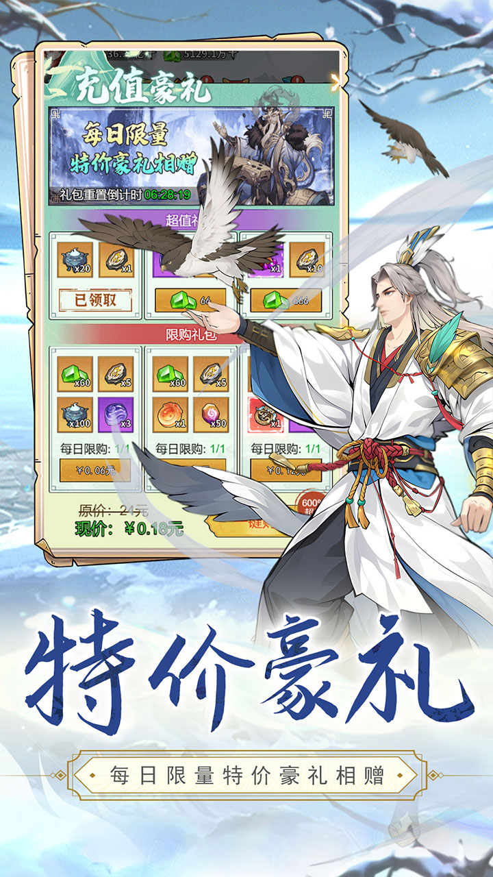 1.全场0.1折震撼来袭,每天更有免费6480元代金券 2.药鼎限时锤炼,锤的越多给的越多,奖励送不停 3.七日签到领好礼,橙色兽灵自选等你拿 4.首充仅需0.06元即可领取仙品武器 5.首发全民冲榜,豪华奖励领不停