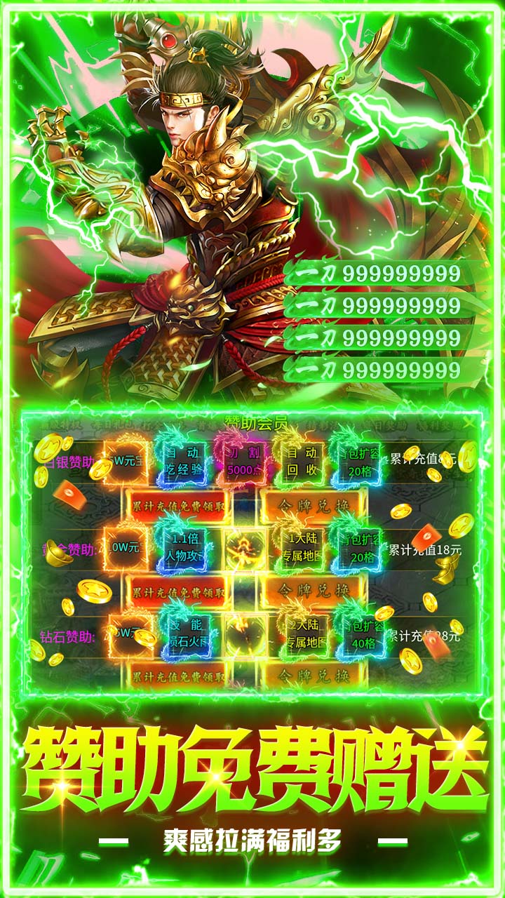 1.创角即送顶级时装;顶级武器;勋章。 2.赞助会员:登录免费赠送。 3.在线领好礼:在线领取大量元宝和金刚币。 4.千万元宝:在线领取千万元宝,先到先得。 5.日常任务:完成日常任务获取大量切割点,砍怪越砍越轻松。