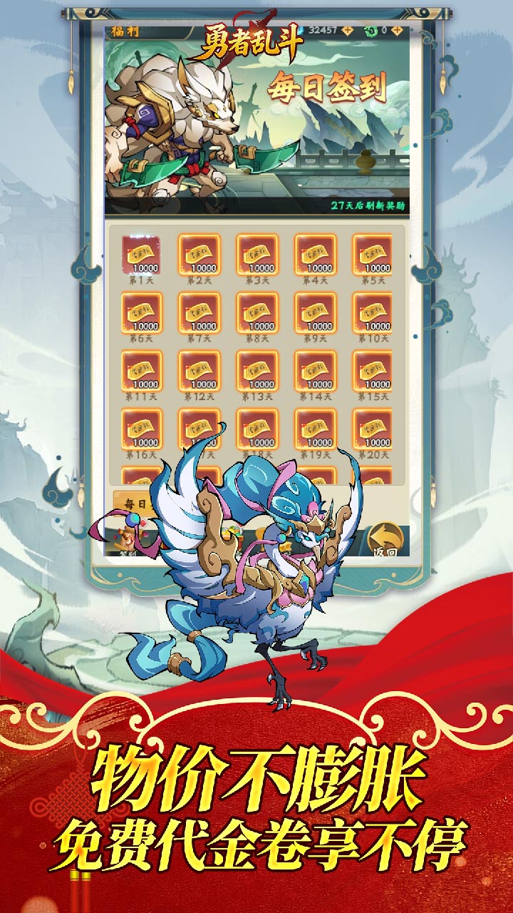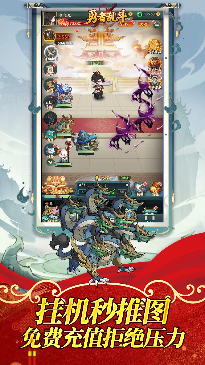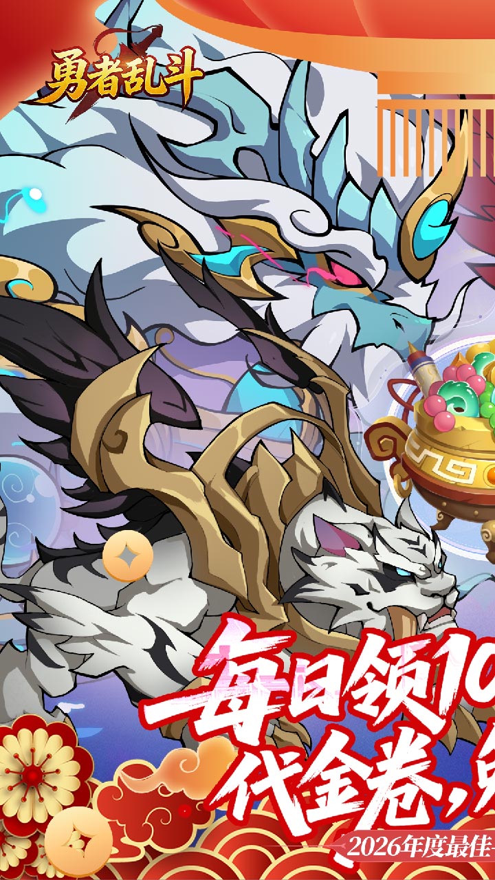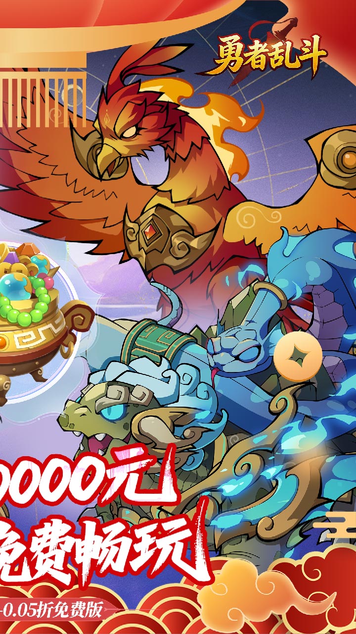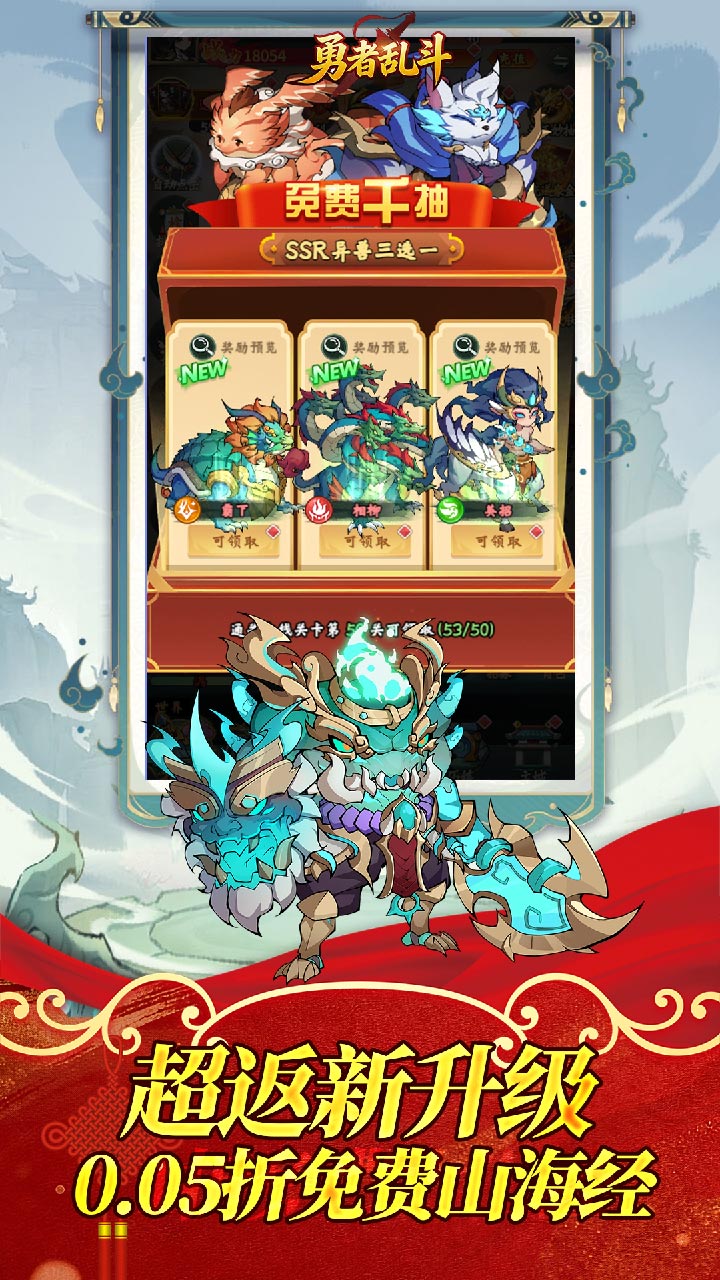 游戏介绍《勇者乱斗(0.05折万元代金免费版) 》喜欢玩免费版咸鱼的朋友有福了、这是一款以山海经为题材的开箱卡牌手游、每天上线领10000代金卷、真正实现了免费零氪版,游戏中涵盖山海经所有奇珍异宝和山海神兽、无限孵化异蛋、融合多种PVE/PVP玩法和趣味养成路线、全自动托管放置解放双手,无需操作,满配山海图鉴、带着自己组建好的异兽去平定四海吧~