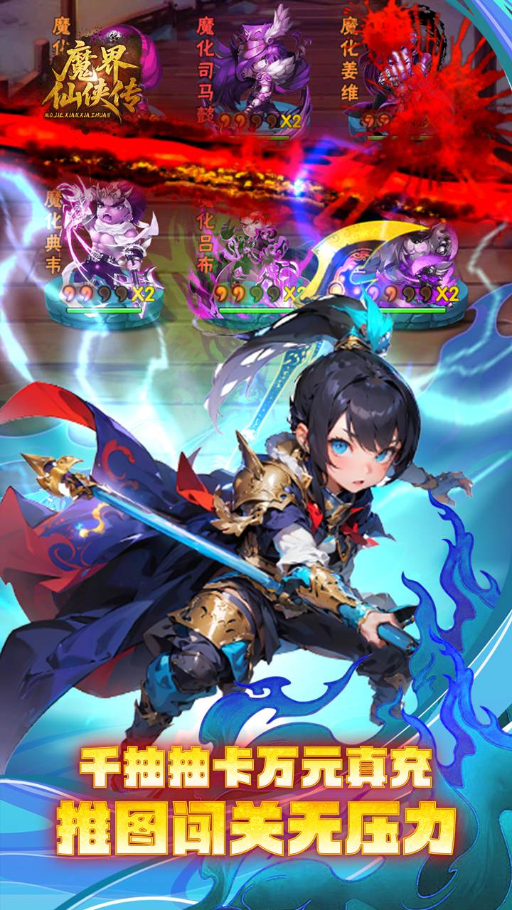 游戏介绍0.1折三国少年卡牌《魔界仙侠传(0.1折少三代金直充版)》正式上线,魔化三国世界称霸魏蜀吴。上线即送至尊满V特权、1998元真充卡、新手躺平养老礼包,每日登录领万元真充卡、千抽招募令、千元代金券、648x10养老金,7日登陆再拿神卡自选包,集齐神将推图闯关无压力。丰富副本挑战,爽拿海量资源。主公快来魔化三国世界征战沙场!