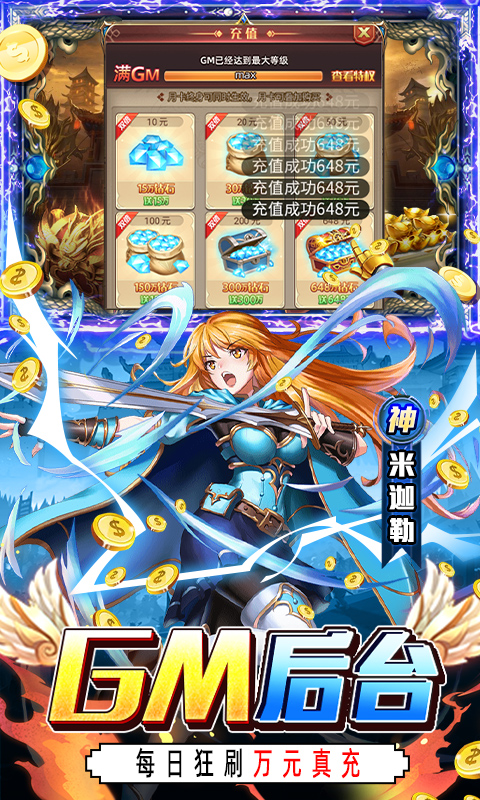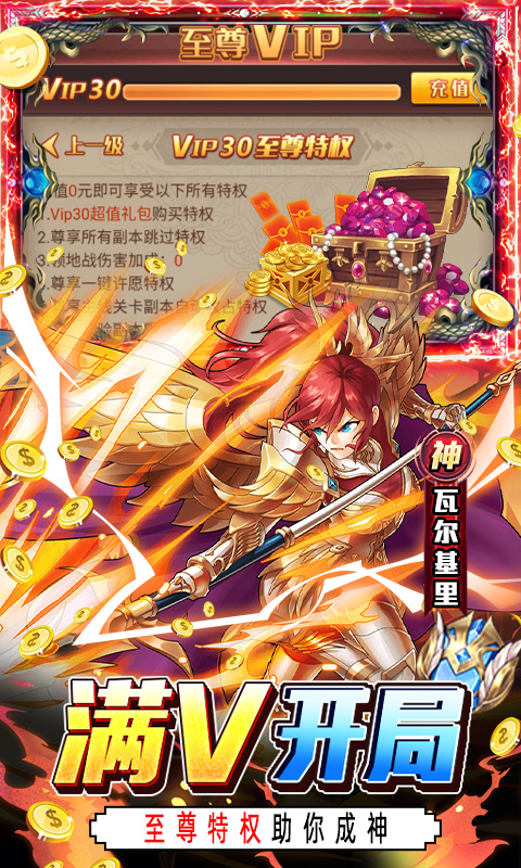 1.上线送满级VIP30、10w钻石、英雄王之剑以及BUG英雄蕾贝娜