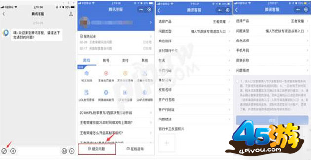2.微信关注公众号【腾讯客服】-点击公众号下方S形图标,跳转小程序-选择左下角“提交问题”,选择产品“王者荣耀”,问题类型“情人节皮肤专项退款入口”(退人民币请选此入口)/情人节皮肤专项退点券入口(退点券请选此入口),按照提示操作,填写平台、大区及相关资料提交(手Q大区的用户也可通过该渠道进行反馈);