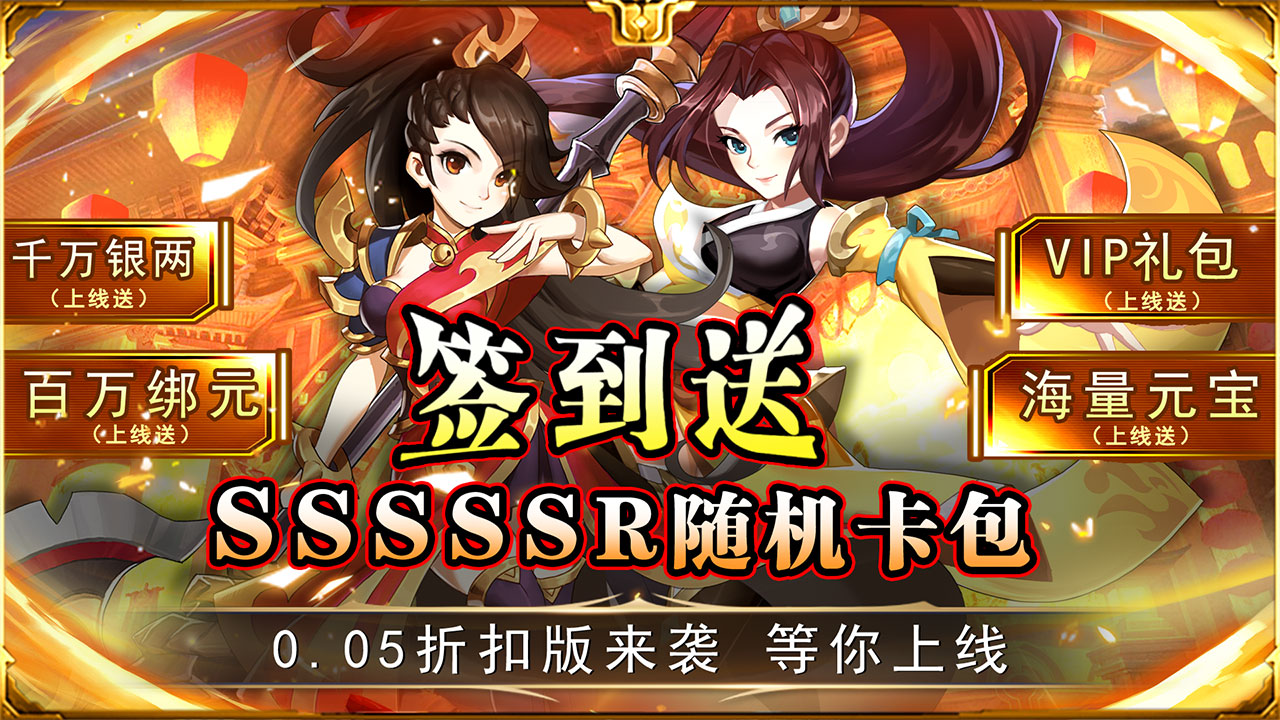 上线福利:送GM1、88w元宝、200w绑元、1000w银两、SSSSSR随机礼包*1、金装碎片*500、高级技能洗练石*20(创角福利礼包获取)