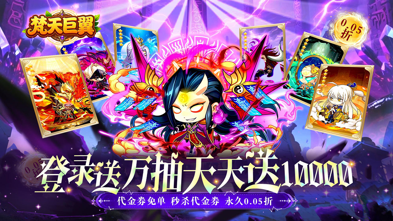 《梵天巨翼》是一款Q版国风题材的卡牌+塔防回合制游戏。你将化身主公,带领英雄们征战天下!烧脑策略秀操作,每个武将也都各具特色,趣味的玩法,休闲的画风,简单的操作,原创“满屏技能释放”,带来燃尽十足的战斗快感,每日福利拉满,永久0.05折,天天送10000代金券,让战斗在你的指尖生动重现。