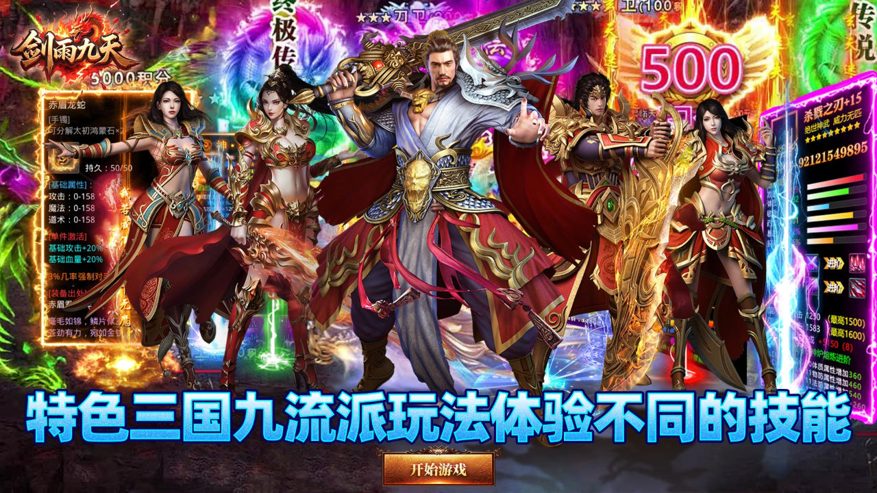 特色三国九流派玩法,选择不同流派体验不同的技能,搭配心法、神剑、铭文打造您的专属唯一玩法!