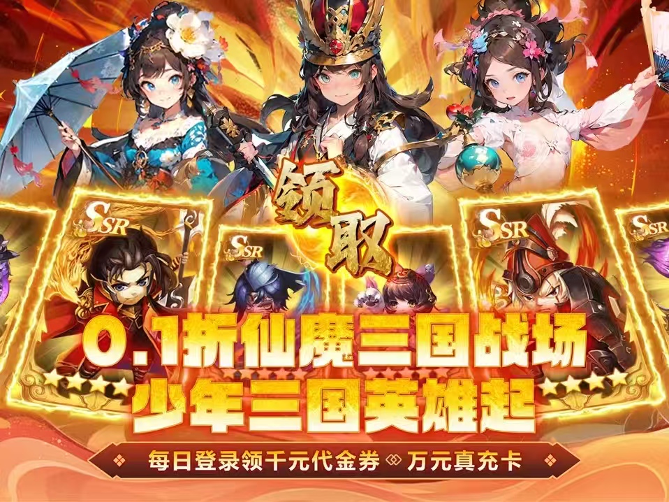 0.1折三国少年卡牌《魔界仙侠传(0.1折少三代金直充版)》正式上线,魔化三国世界称霸魏蜀吴。上线即送至尊满V特权、1998元真充卡、新手躺平养老礼包,每日登录领万元真充卡、千抽招募令、千元代金券、648x10养老金,7日登陆再拿神卡自选包,集齐神将推图闯关无压力。丰富副本挑战,爽拿海量资源。主公快来魔化三国世界征战沙场!