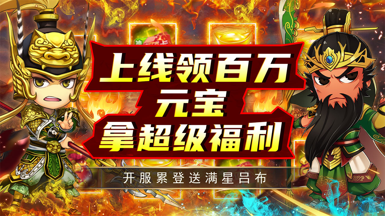【游戏介绍】 是一款以三国为主题,结合中国传统神话故事创作的挂机类回合手游,在游戏中玩家将扮演一名主公,收服武将,培养上古神兽,制霸神话三国世界,赶紧来下载体验吧! 【游戏特色】 上线即送100w元宝、188w绑元、1亿铜钱 1.签到领取海量元宝 2.累计登录领取充值卡 3.升级得金将包、充值卡豪华道具 4.闯关送海量碎片兑真充